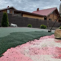 5. материалы: Химтраст ПУ-Клей для резиновой крошки (1К), Химтраст Праймер-РК (1К), Резиновая крошка коричневая, Резиновая крошка изумруд;